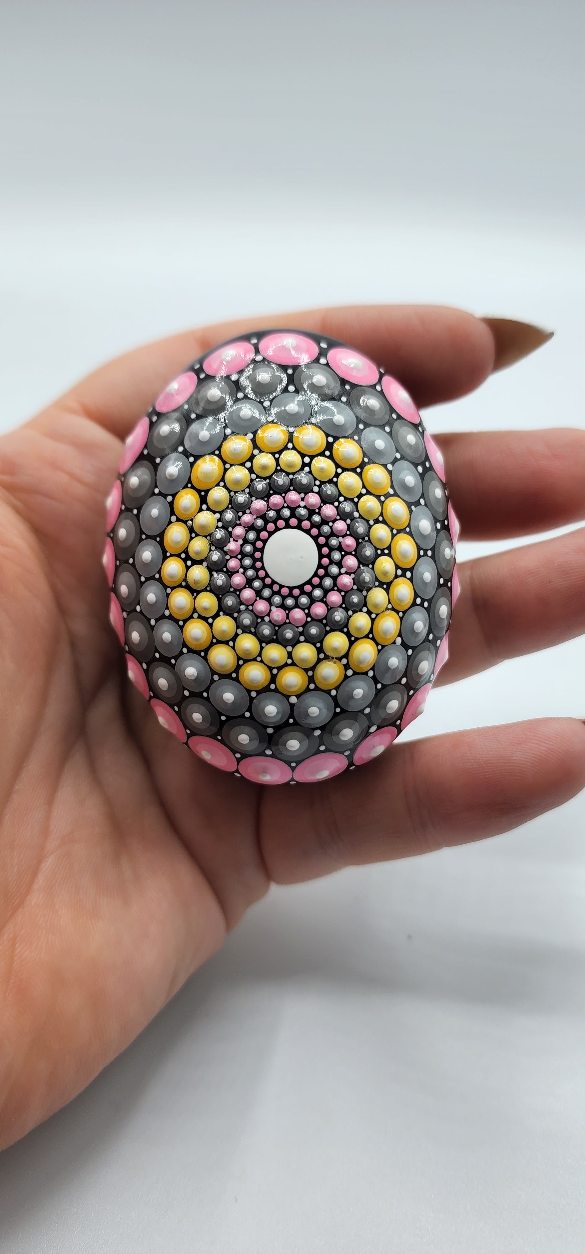 This hand made mandala palm stone was brought to life with a black background and shades of pink and yellow and gray with white accents! This sacred geometry pattern is so relaxing. This piece feels calm when I hold it, do you need some calm in your life? This might be the stone for you! The bottom is covered in felt to ensure a smooth surface.