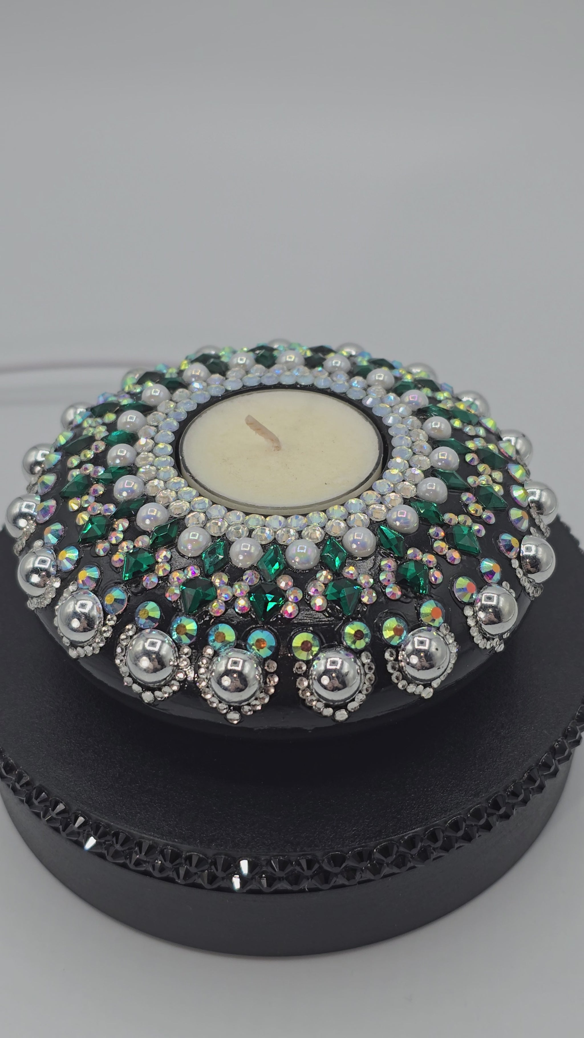 This handmade mandala stone was brought to life with a black background and high-quality glass rhinestones applied in a sacred geometry pattern. Silver, emerald green and aurora borealis also pearls. Candle not included, these fit regular tealight candles.