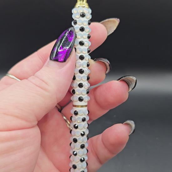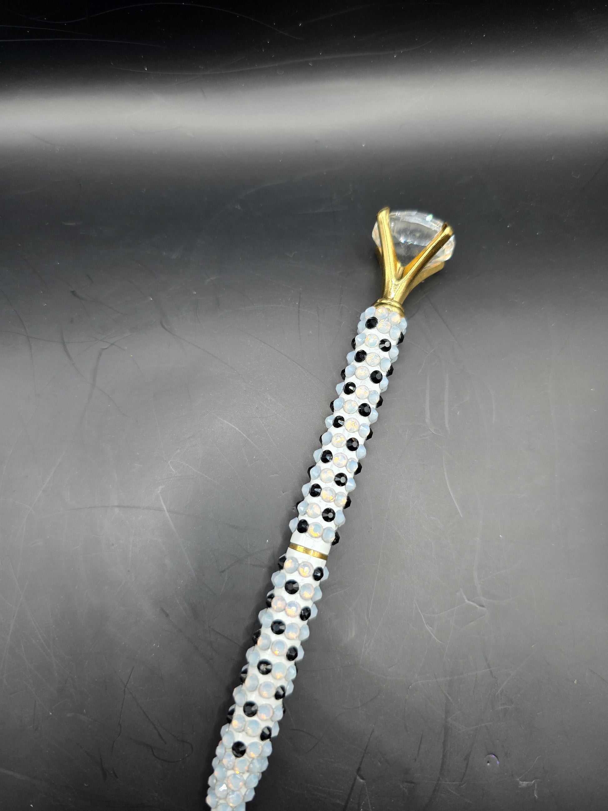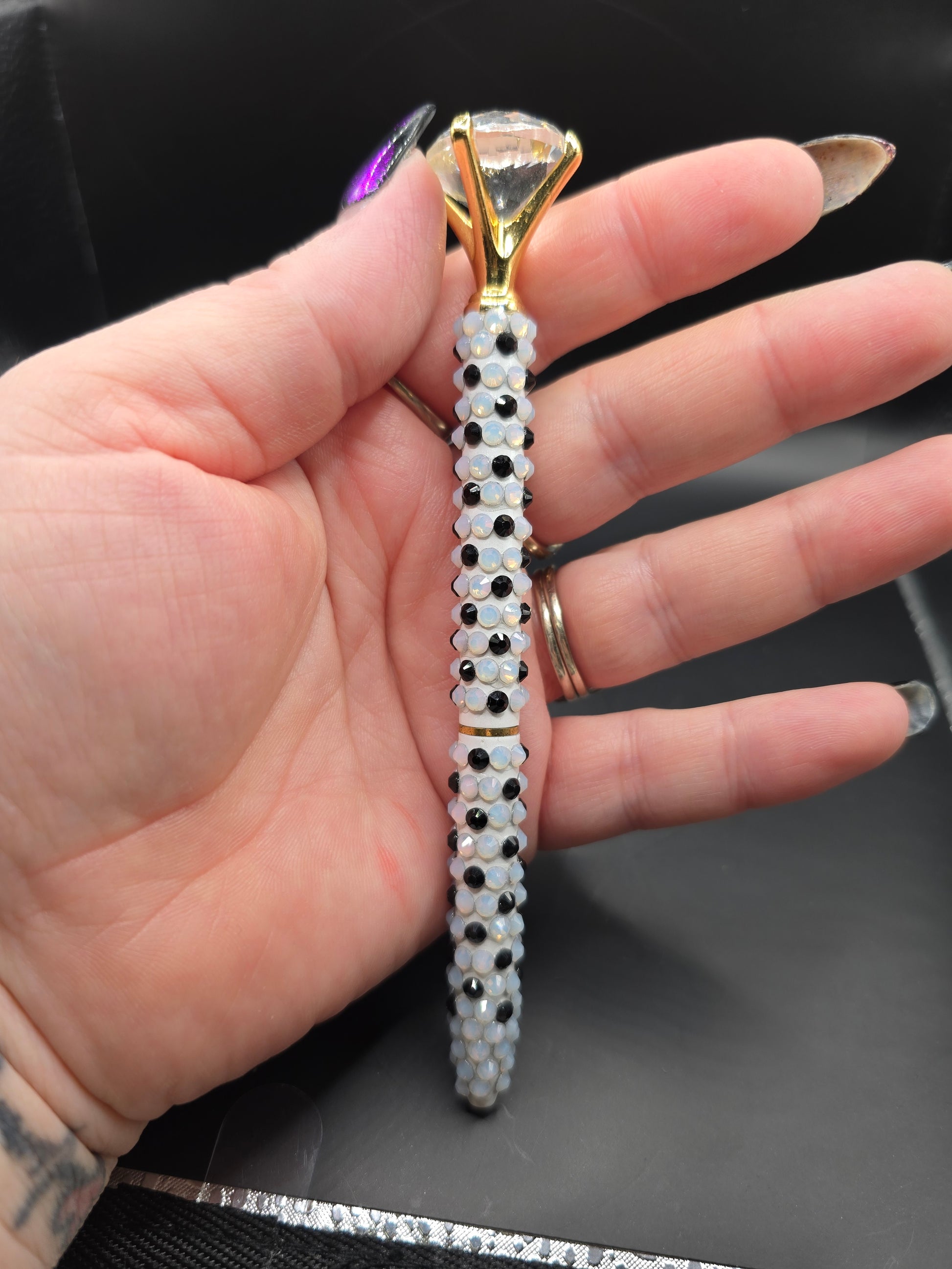This hand made rhinestone, bling pen can be used for everyday life, the pen comes apart in the middle and the ink can be changed out. Comes with black ink. Then high quality black and white glass rhinestones are adorned on the outside of the pen. Has a gold clasp with a faux diamond at the top.