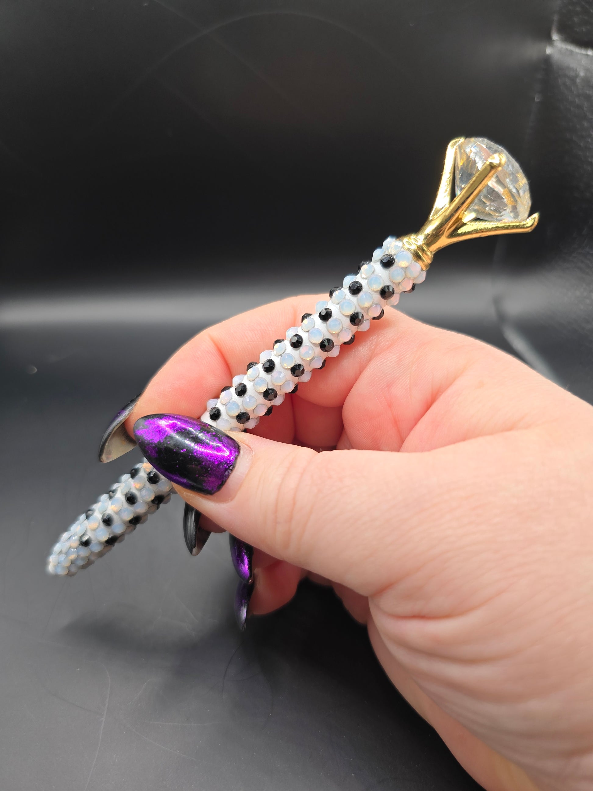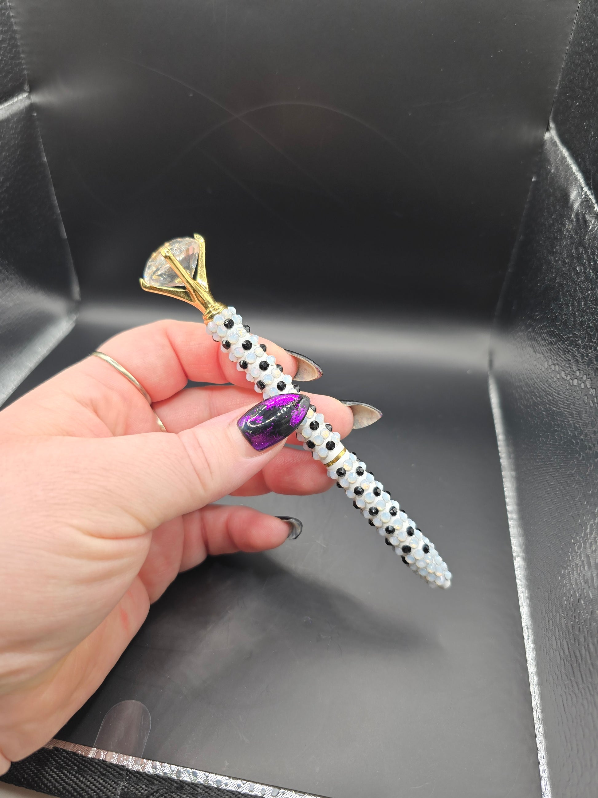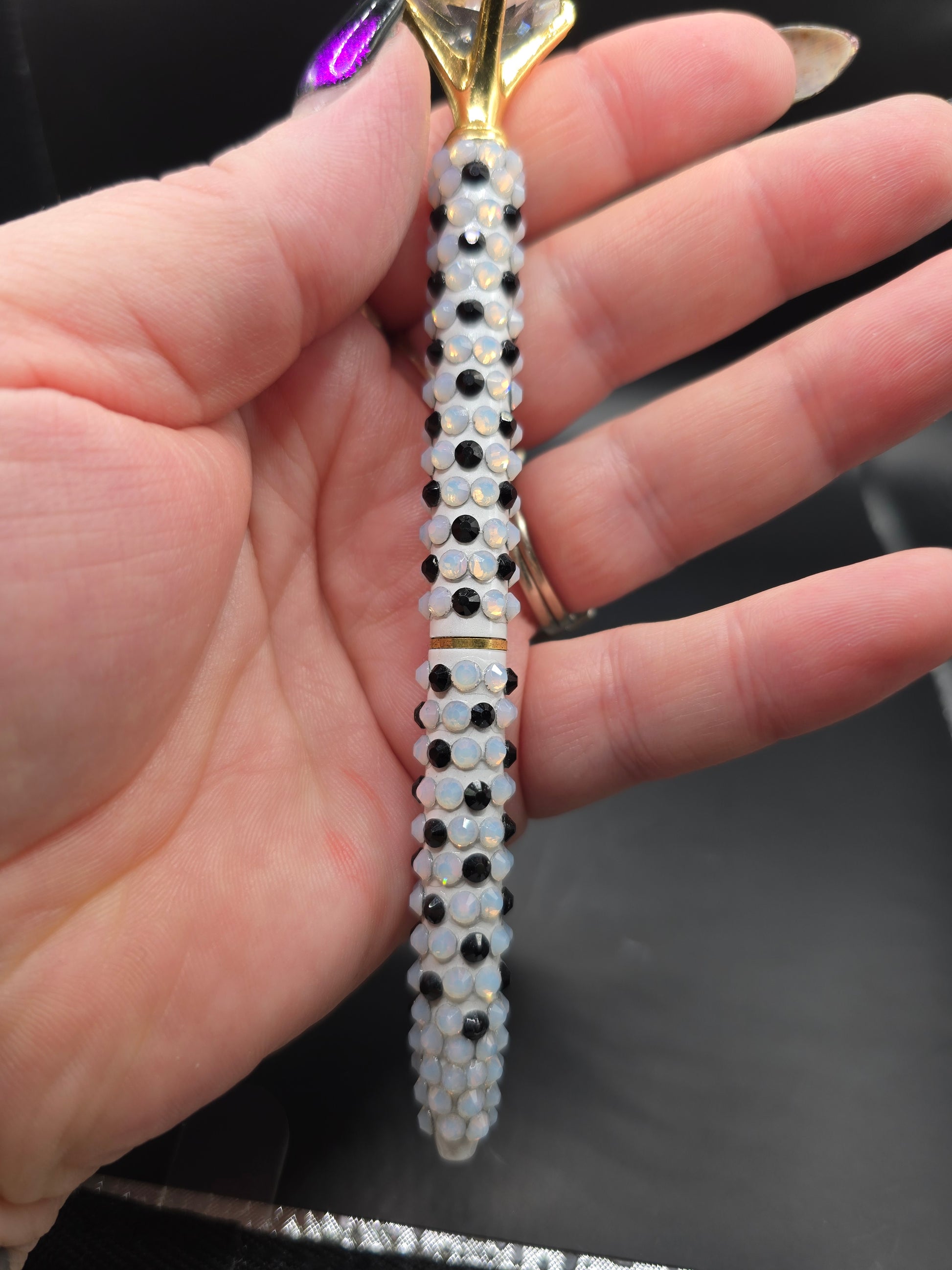 This hand made rhinestone, bling pen can be used for everyday life, the pen comes apart in the middle and the ink can be changed out. Comes with black ink. Then high quality black and white glass rhinestones are adorned on the outside of the pen. Has a gold clasp with a faux diamond at the top.
