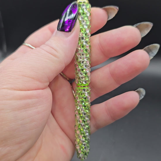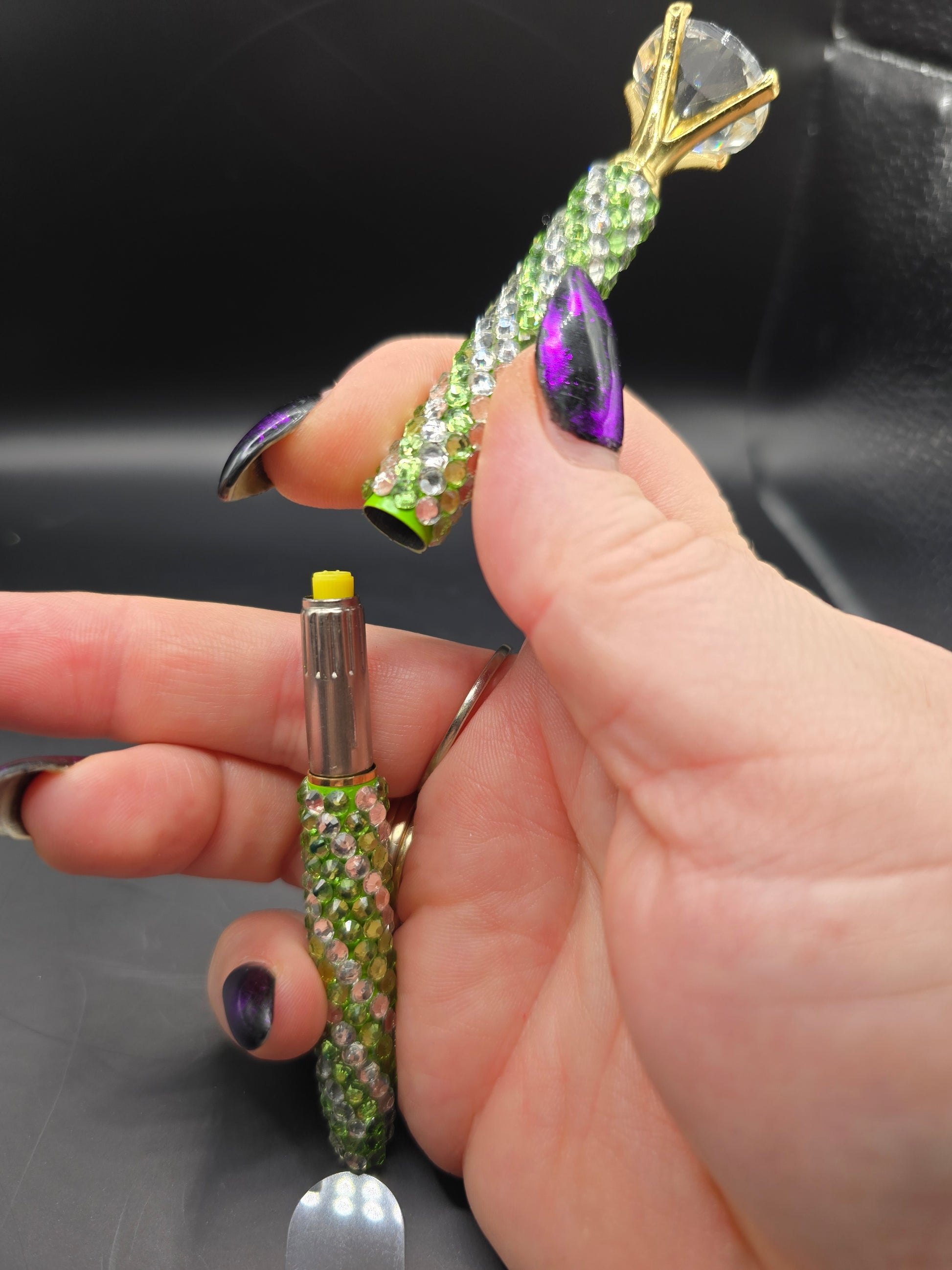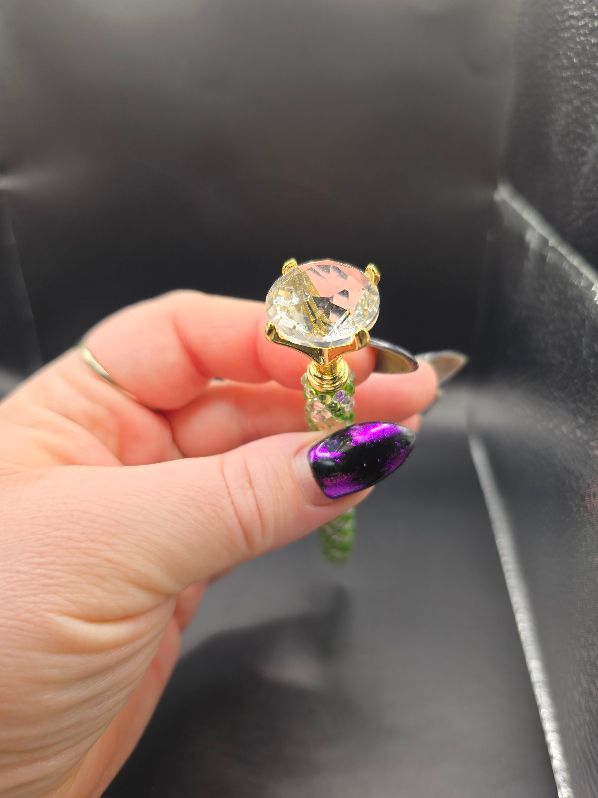 This hand made rhinestone, bling pen can be used for everyday life, the pen comes apart in the middle and the ink can be changed out. Comes with black ink. Then high quality green and silver glass rhinestones are adorned on the outside of the pen. Has a gold clasp with a faux diamond at the top.
