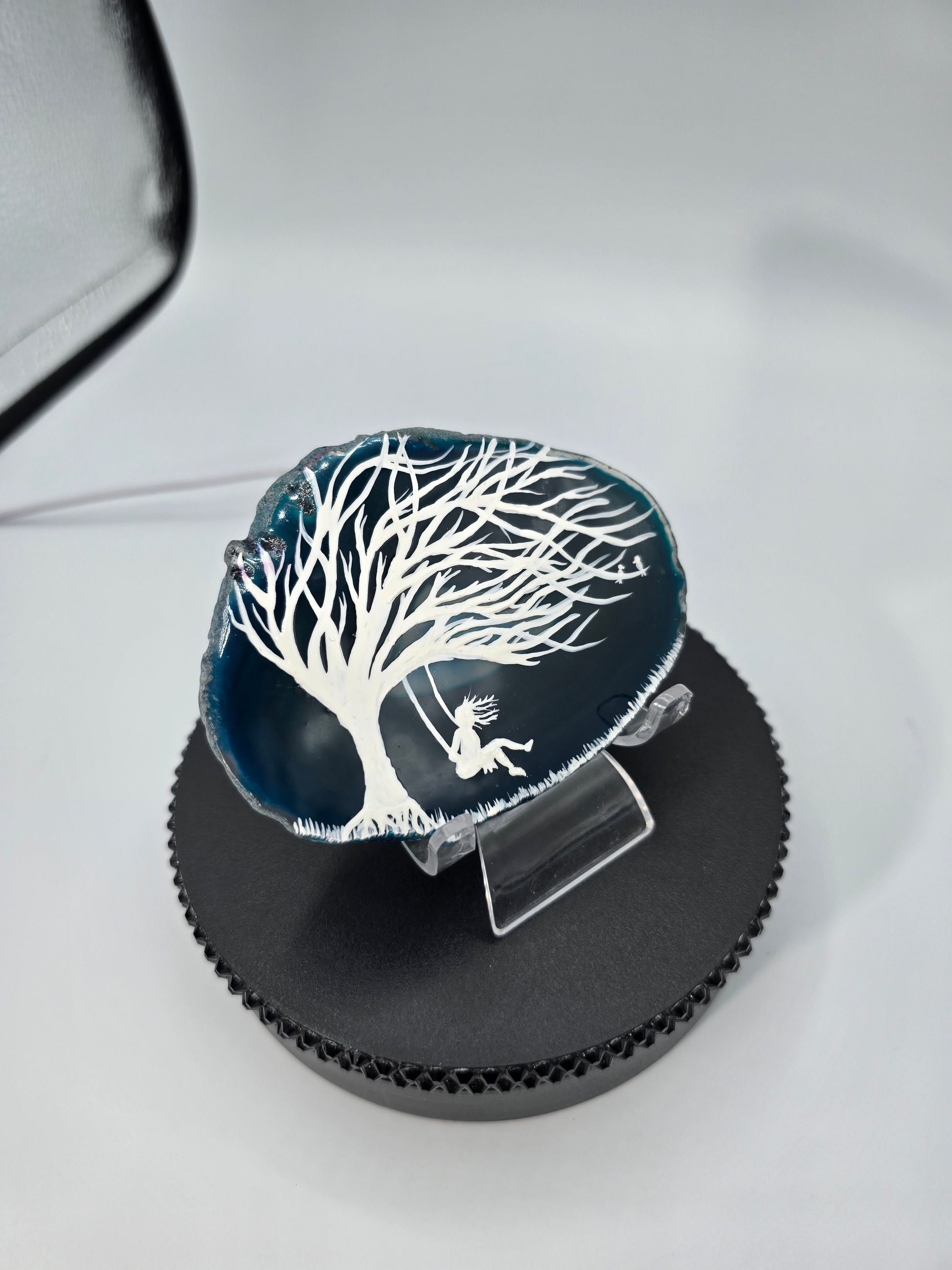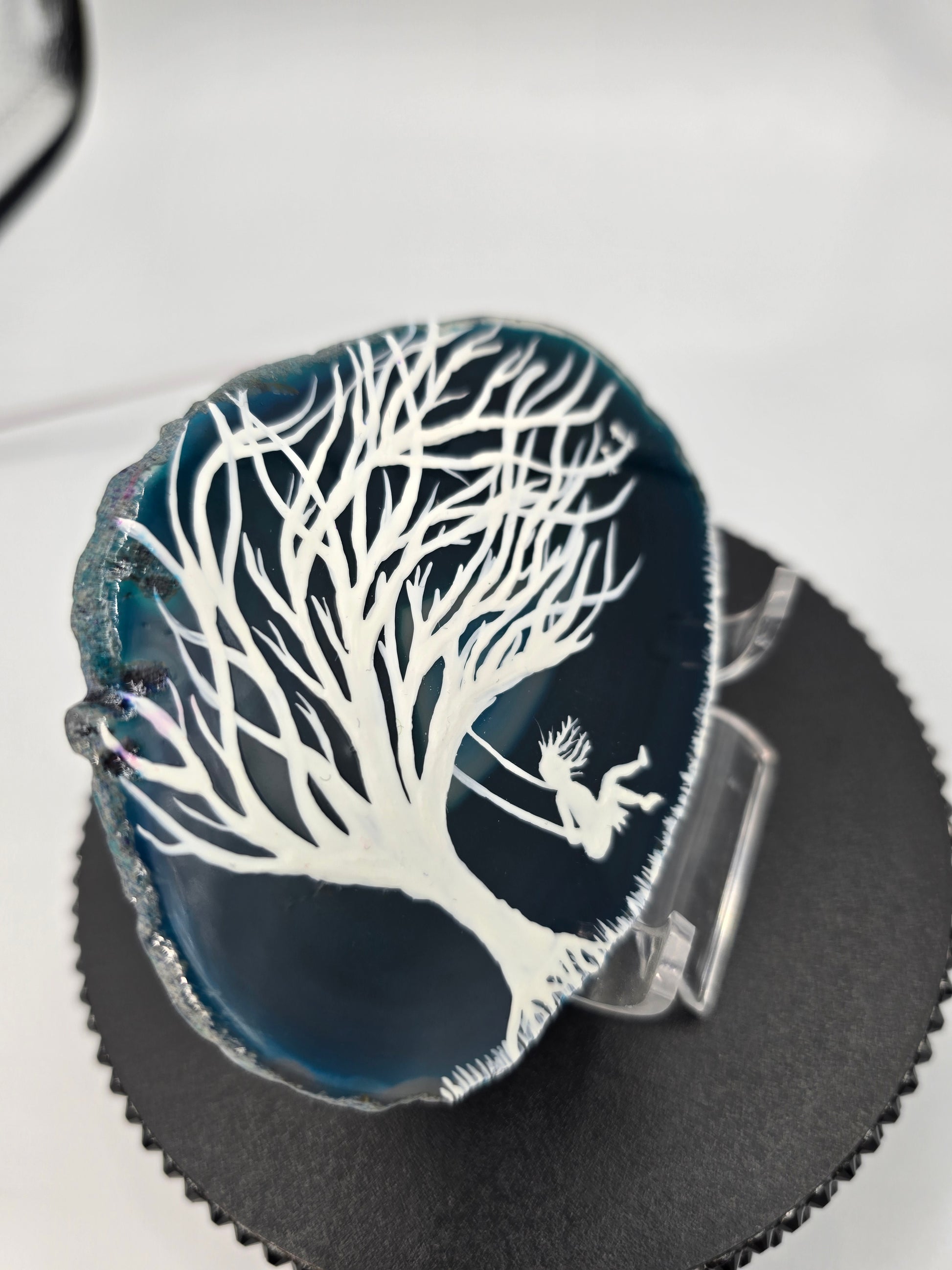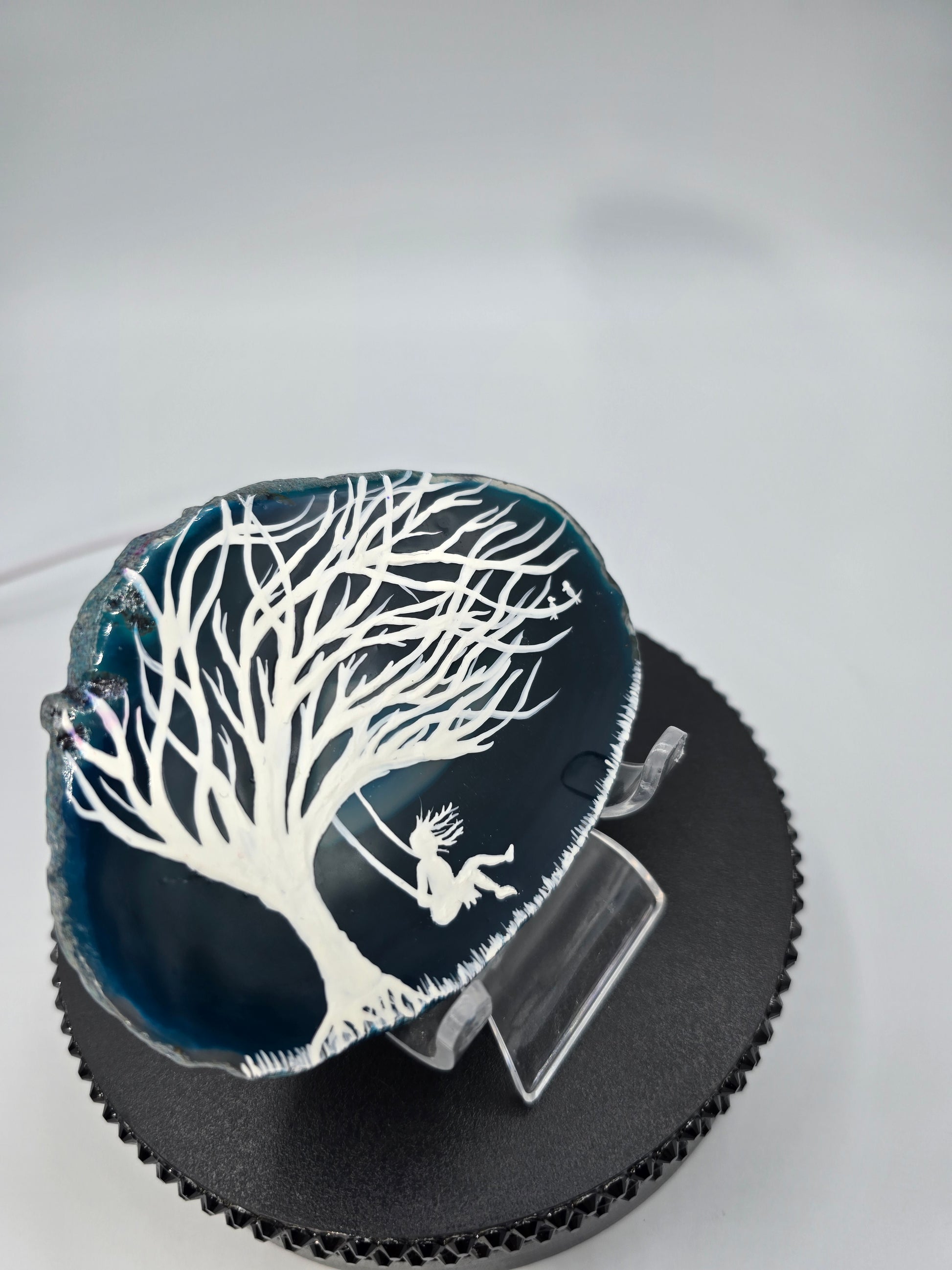 This luxury natural agate slice, with the hand painted design of a girl swinging on a tree swing done on a blue dyed agate slice.
