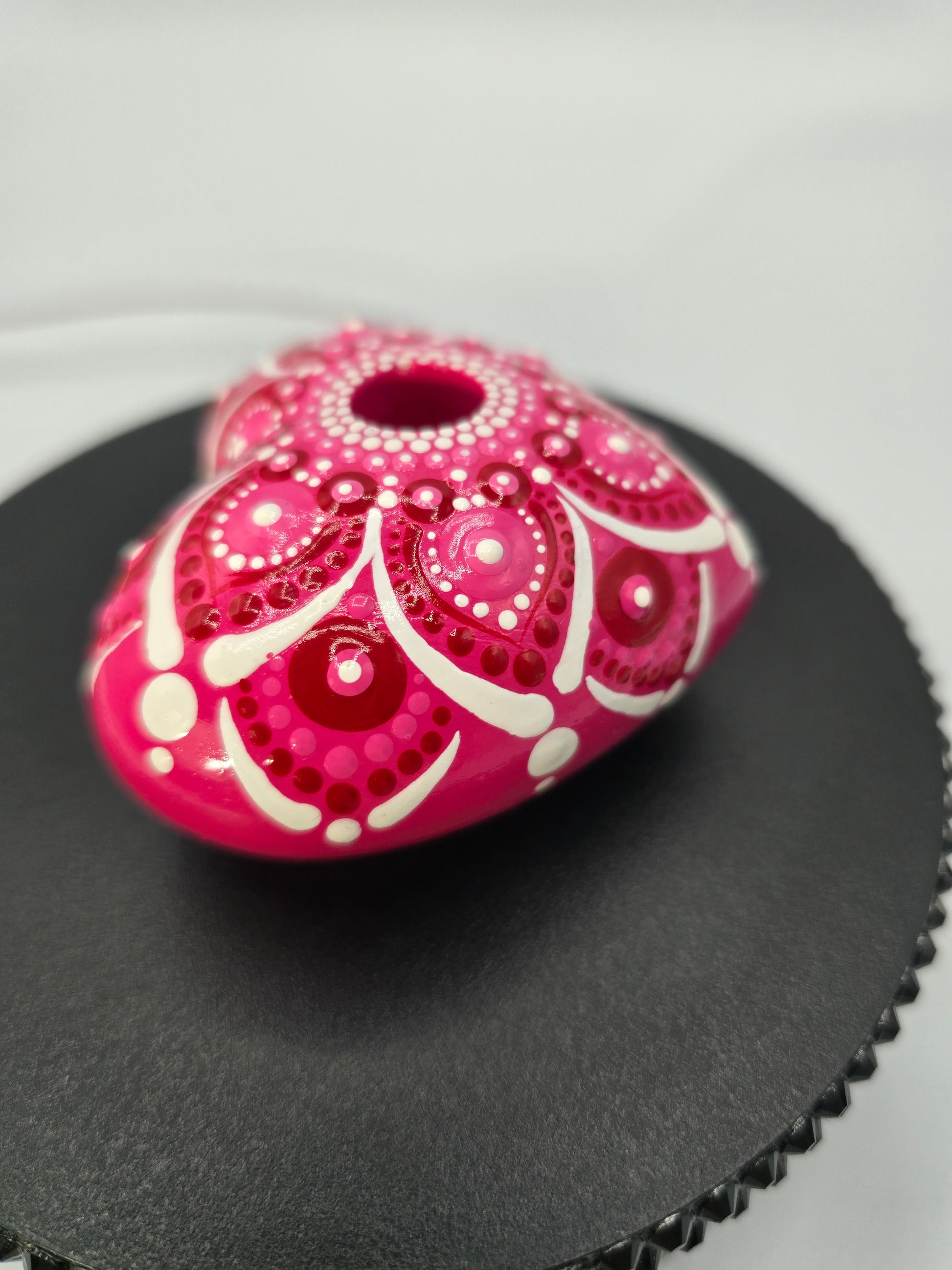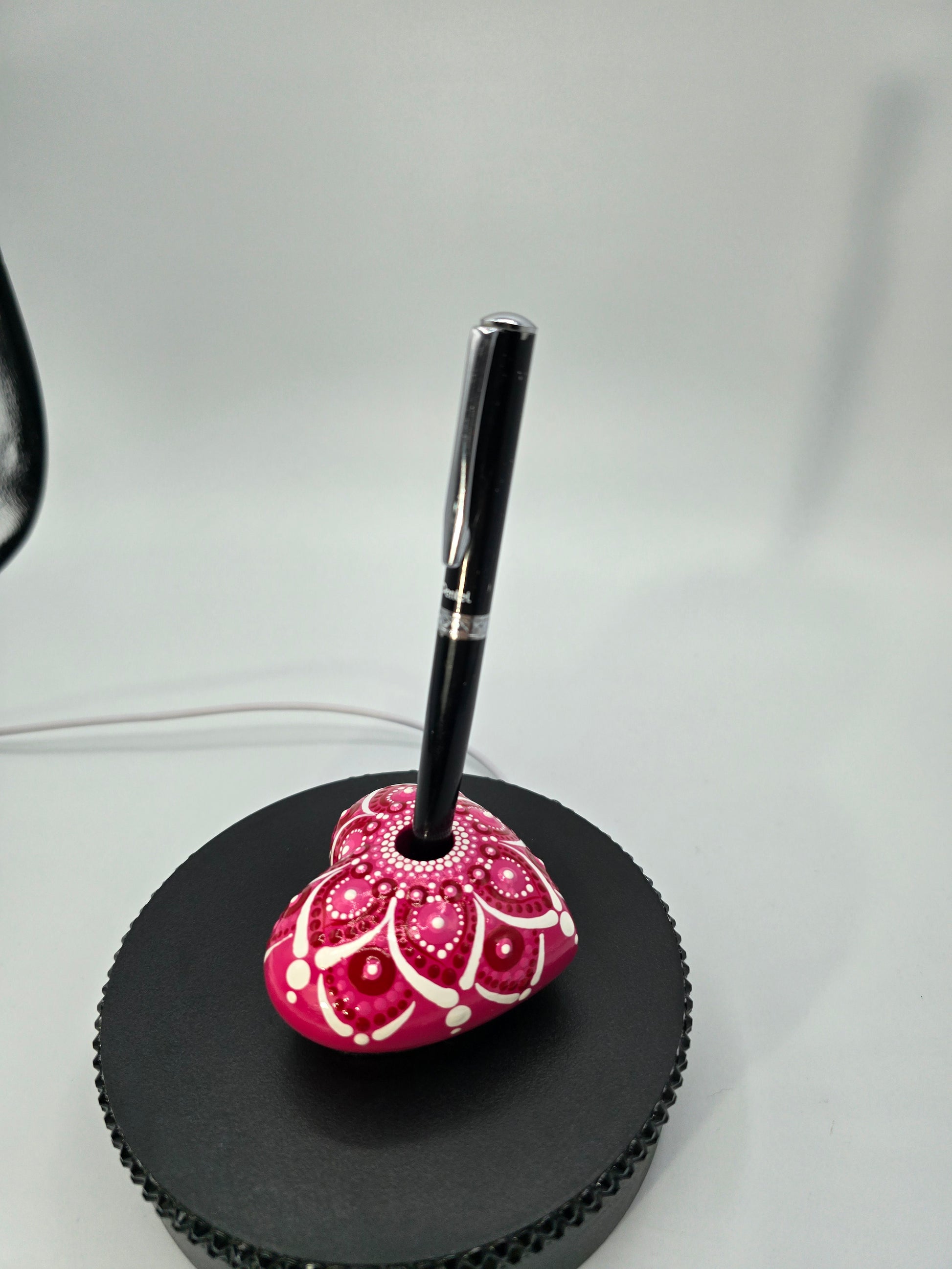 This handmade mandala was brought to life with a beautiful pink background with pink and red mandala with white accents, this is also a super cool pen holder! This sacred geometry pattern is so relaxing. This piece feels calm when I hold it, do you need some calm in your life? This might be the stone for you! The bottom is covered in felt to ensure a smooth surface.