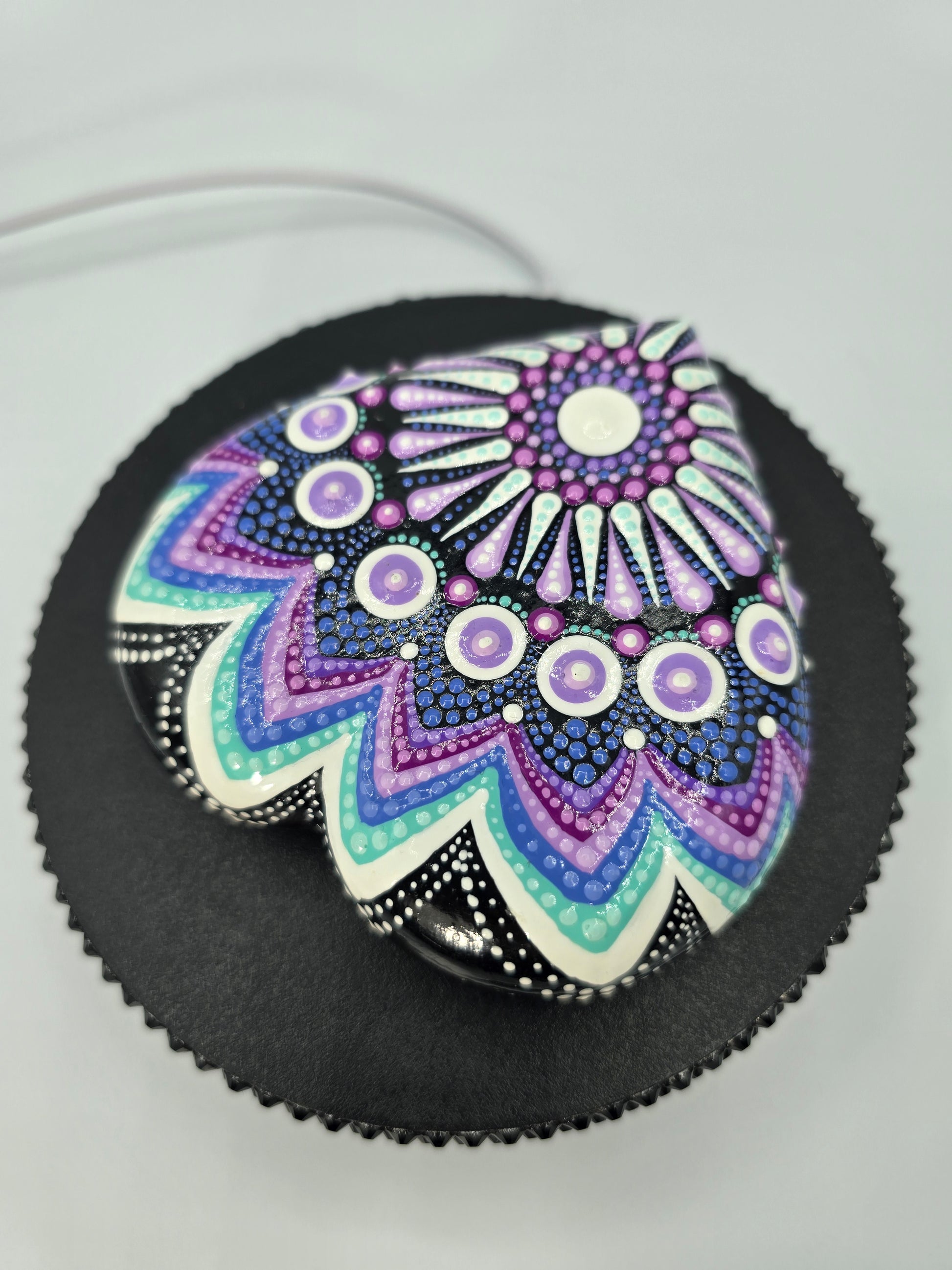 This handmade mandala was brought to life with a beautiful black background with shades teal and purple with white dot accents! This sacred geometry pattern is so relaxing. This piece feels calm when I hold it, do you need some calm in your life? This might be the stone for you! The bottom is covered in felt to ensure a smooth surface.