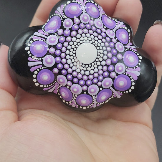 This hand made mandala cloud palmstone was brought to life with an electric purple background and shades of purple with white accents! This sacred geometry pattern is so relaxing. This piece feels calm when I hold it, do you need some calm in your life? This might be the stone for you! The bottom is covered in felt to ensure a smooth surface.