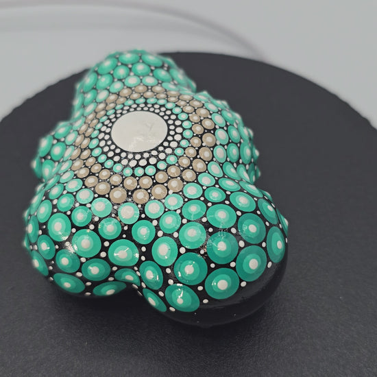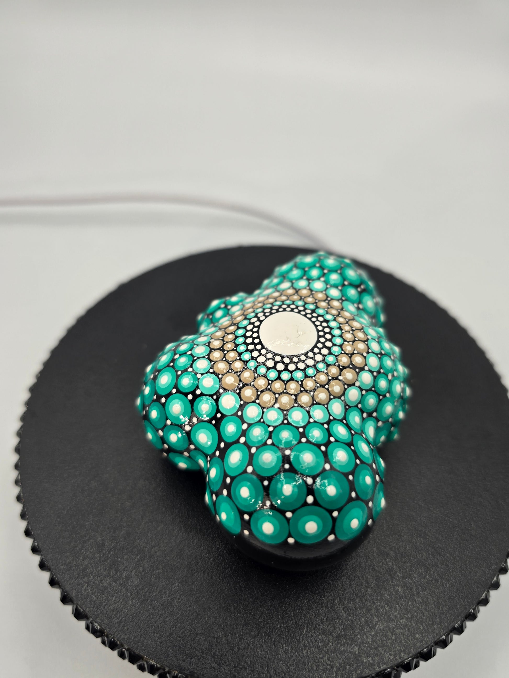 This handmade mandala cloud was brought to life with a beautiful black background with shades teal and brown with white dot accents! This sacred geometry pattern is so relaxing. This piece feels calm when I hold it, do you need some calm in your life? This might be the stone for you! The bottom is covered in felt to ensure a smooth surface.