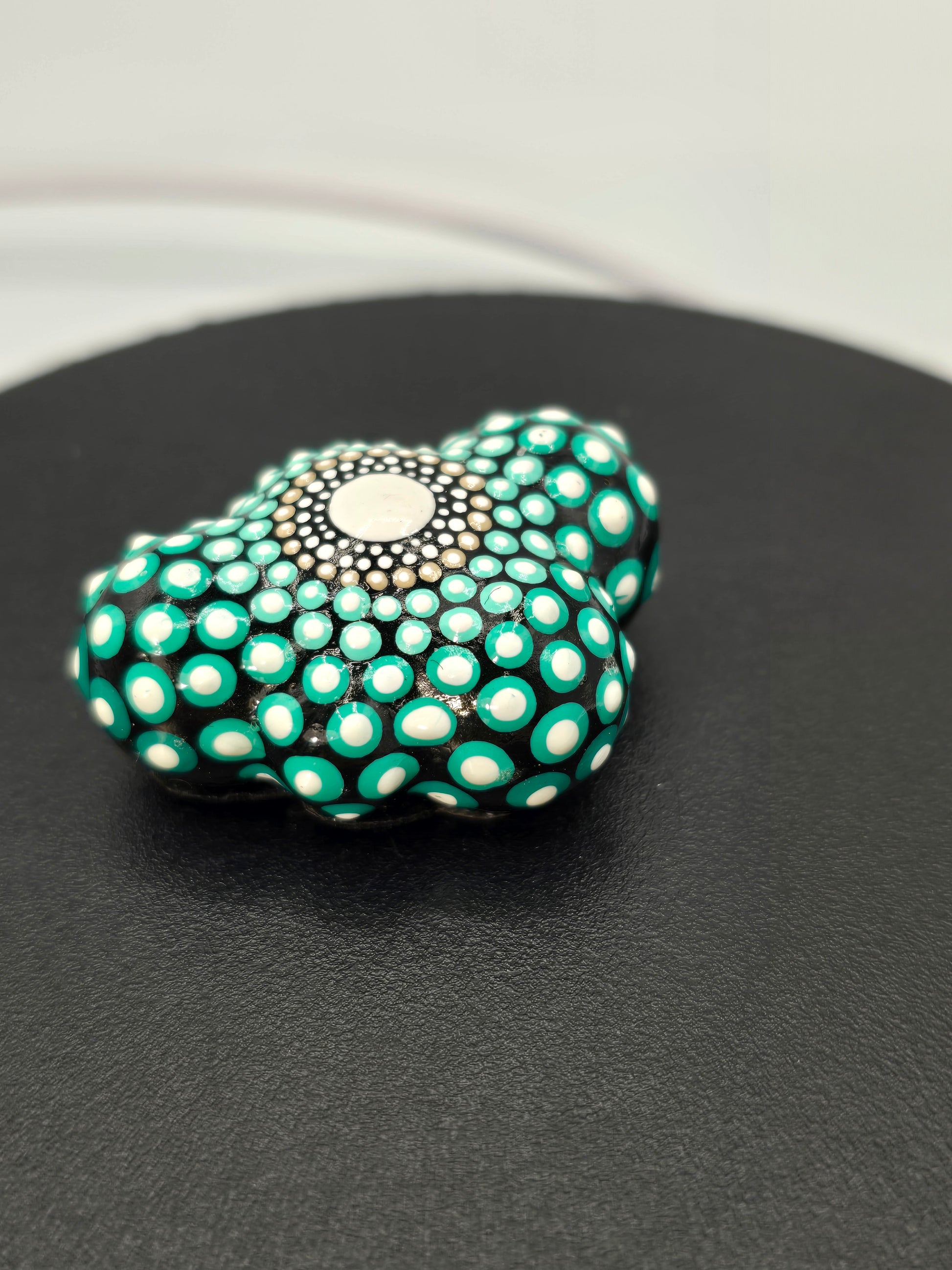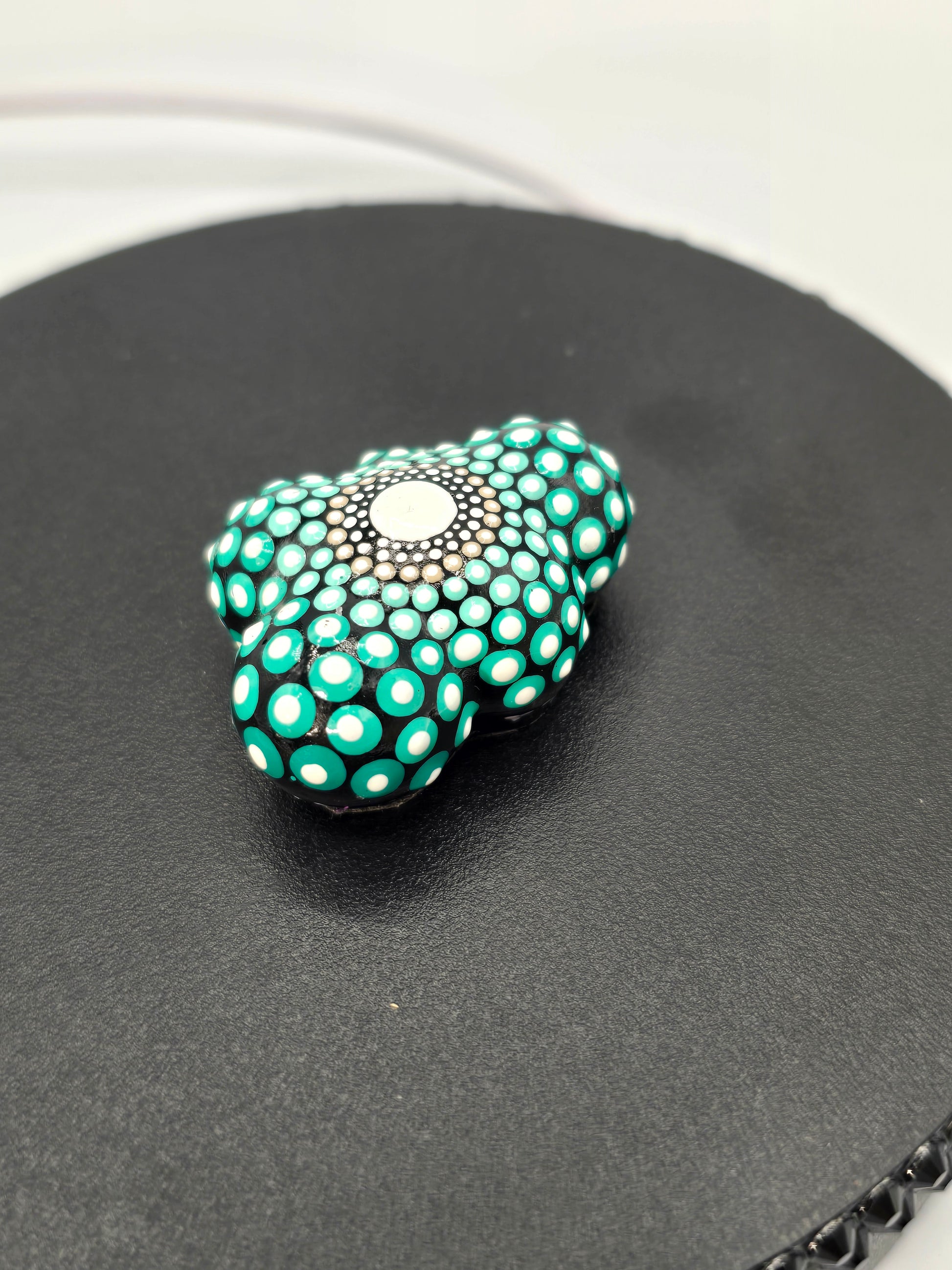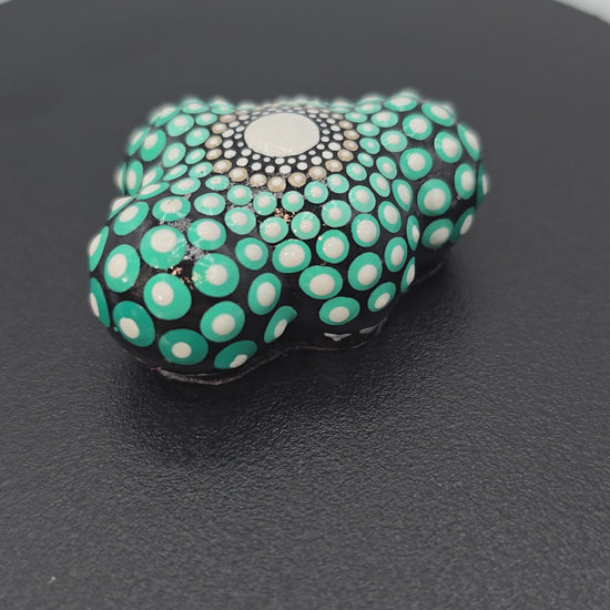 This handmade mandala cloud was brought to life with a beautiful black background with shades teal and brown with white dot accents! This sacred geometry pattern is so relaxing. This piece feels calm when I hold it, do you need some calm in your life? This might be the stone for you! The bottom is covered in felt to ensure a smooth surface.